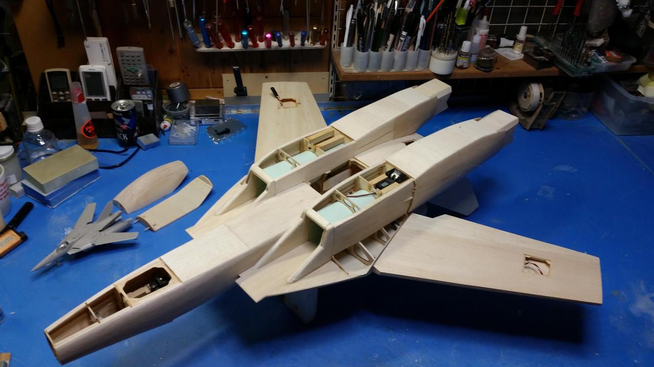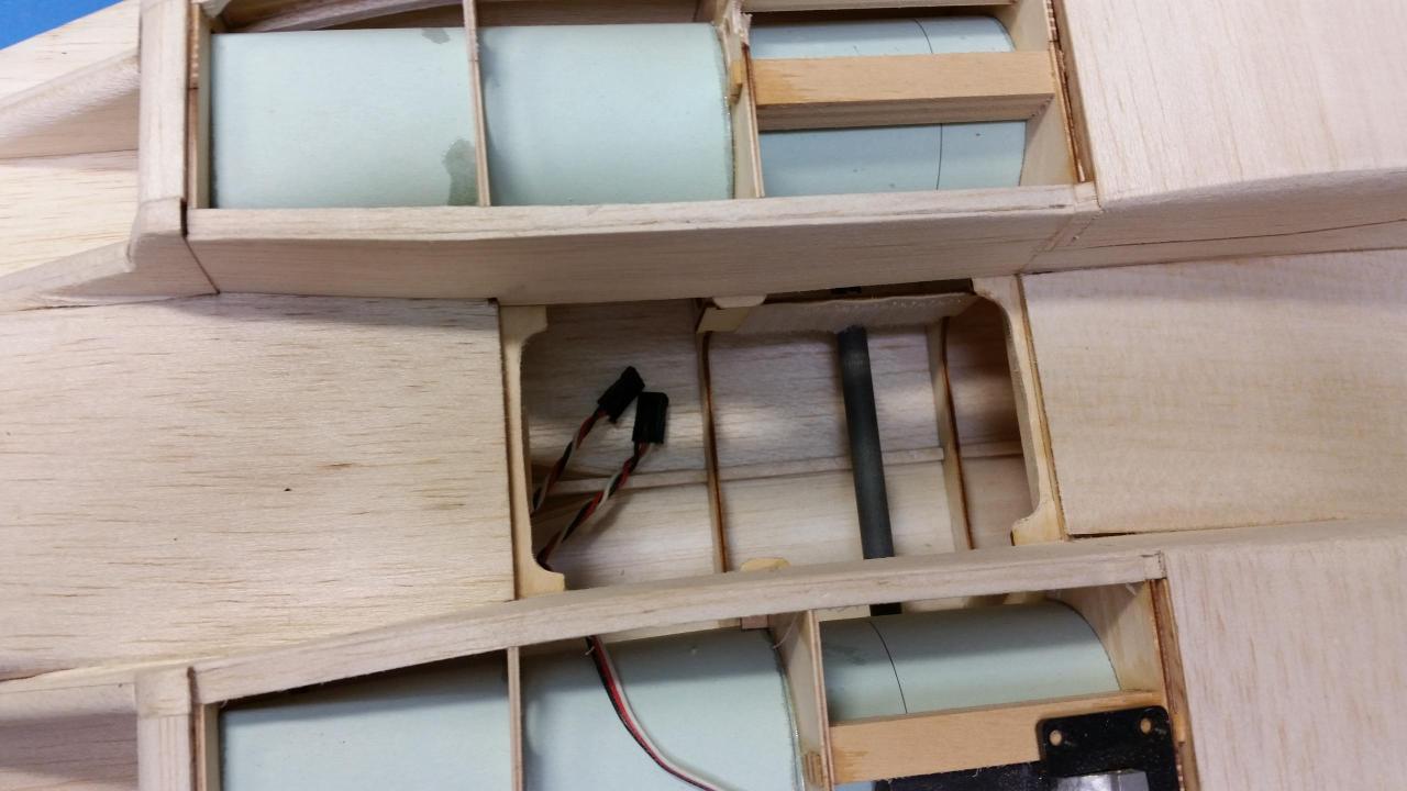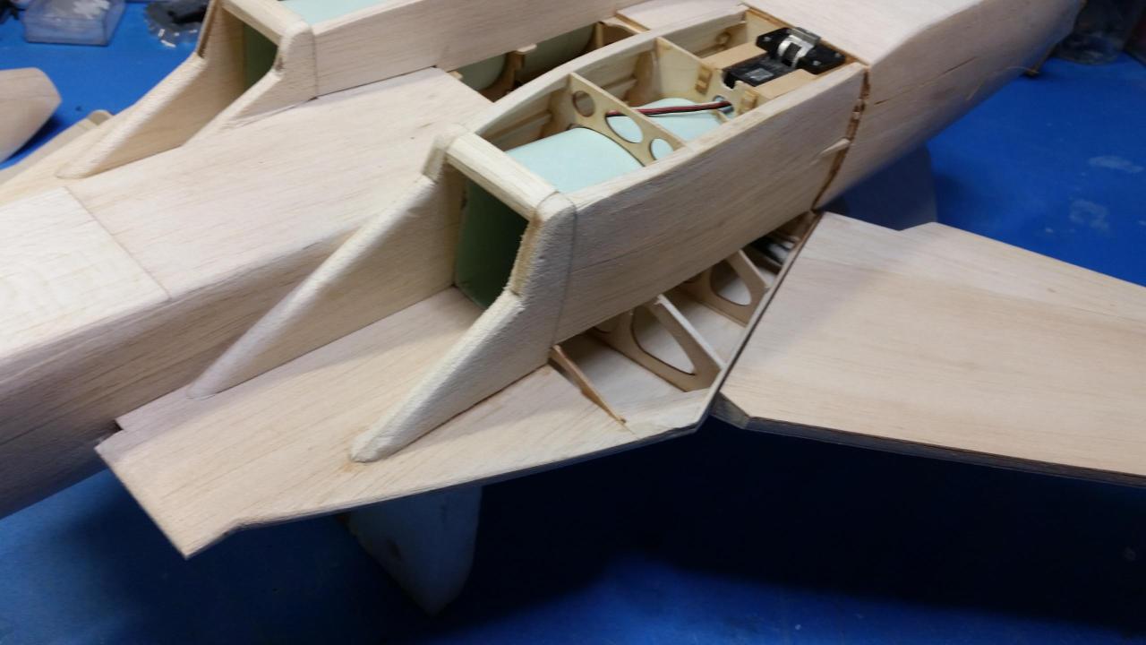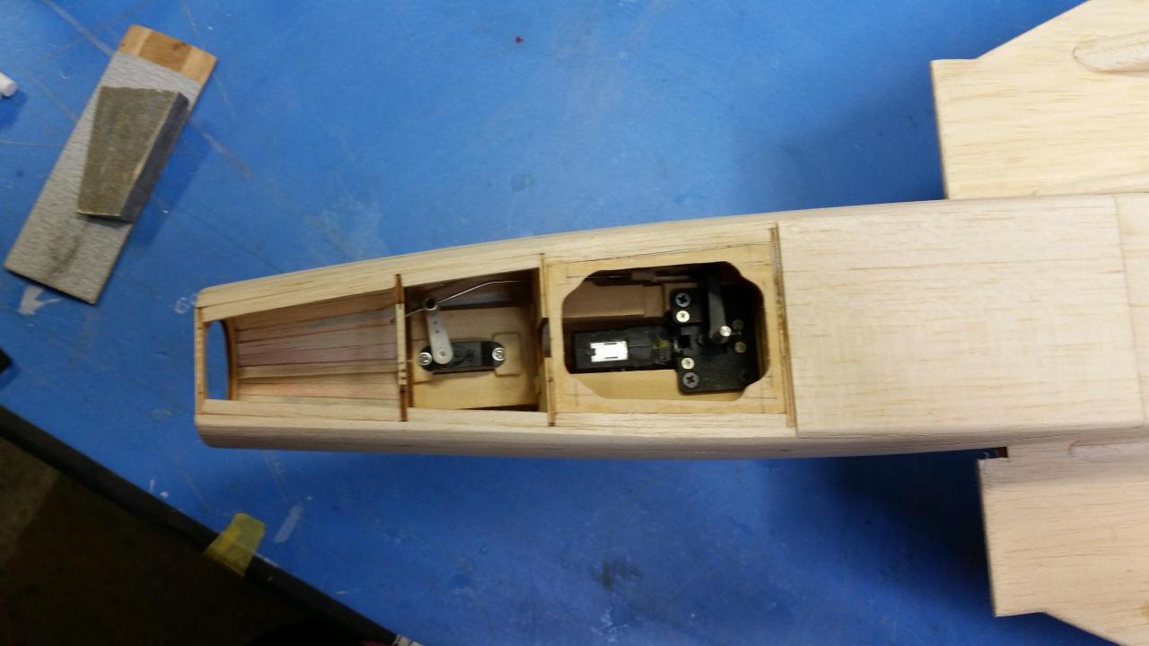 胴体裏面のハッチや、エレベーターサーボハッチを作りながら胴体裏面のプランクを行いました。 主翼もサーボハッチを組み込み形になってきました。