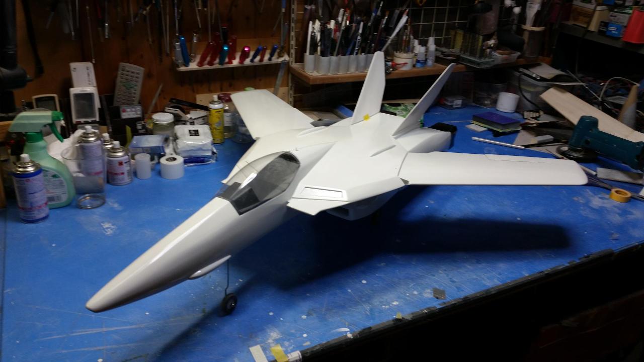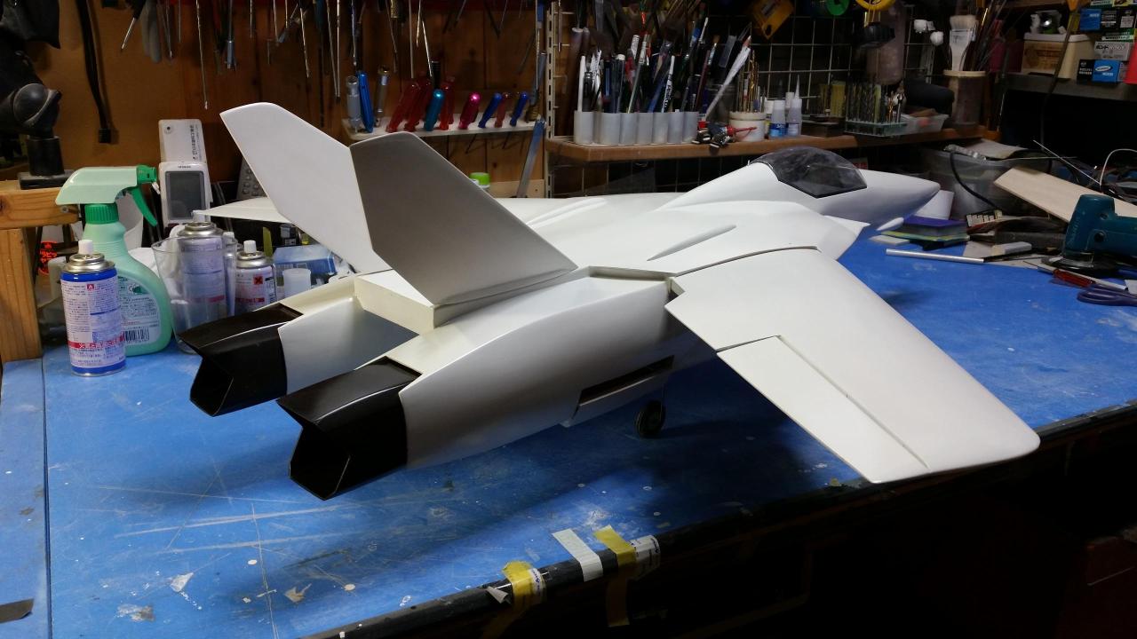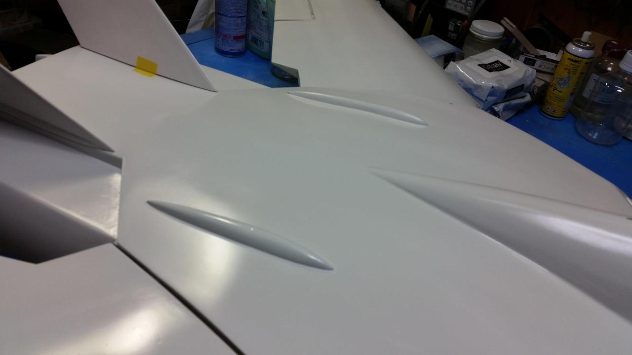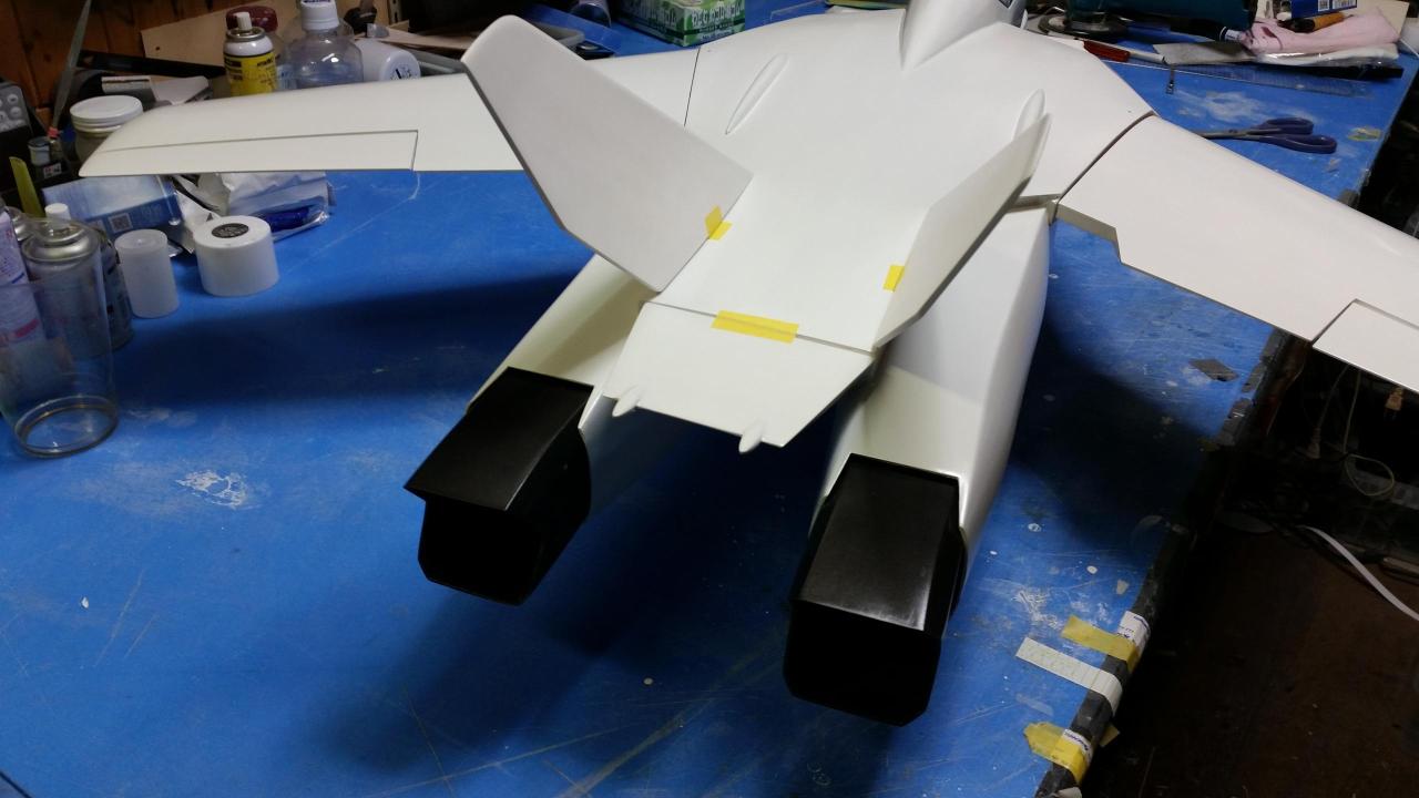 下地のプライマーを塗り、マイクログラス張り、プライマー、サンデングサフェーサー、下地ホワイトを塗りました、バルキリーの特徴的な胴体上のこぶや胴体側面のバーニヤの整形も行いました。