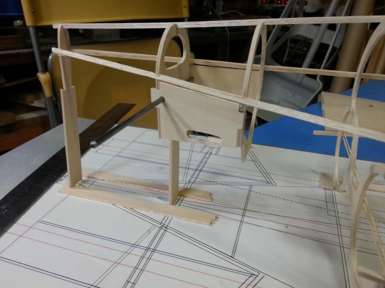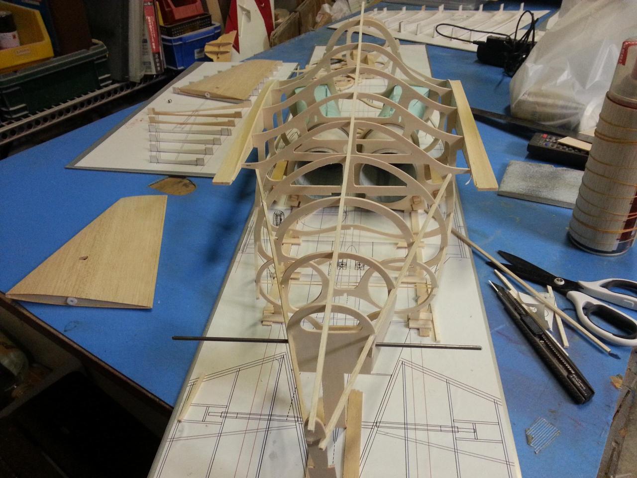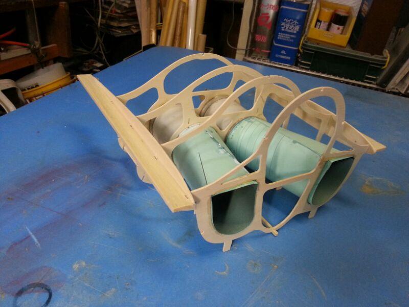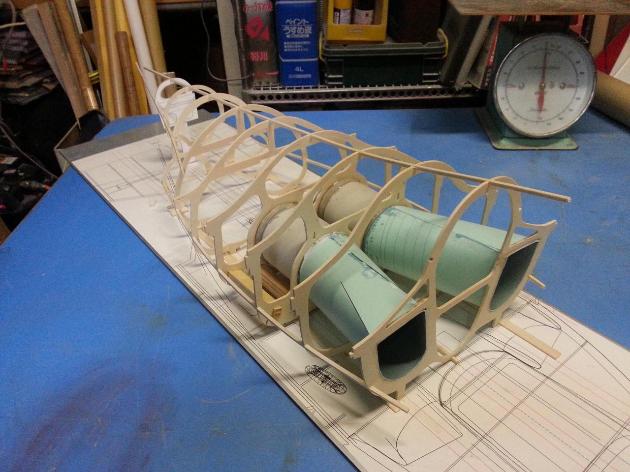 胴体の仮組を初めました。胴体のリブは真っ直ぐにするため、バルサで、補強しました。後で、外せる様に両面テープで、固定です。