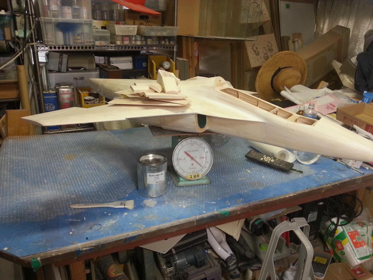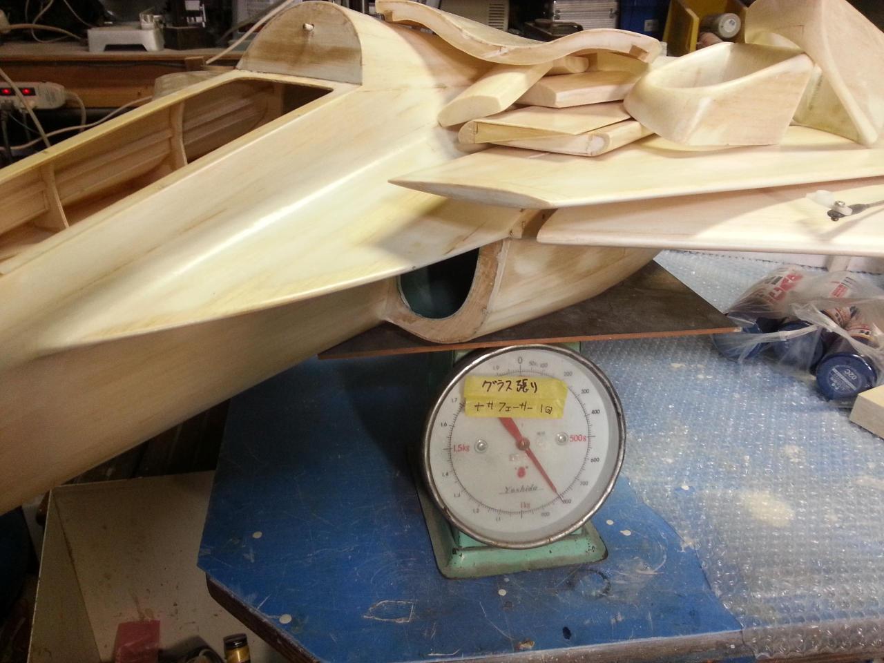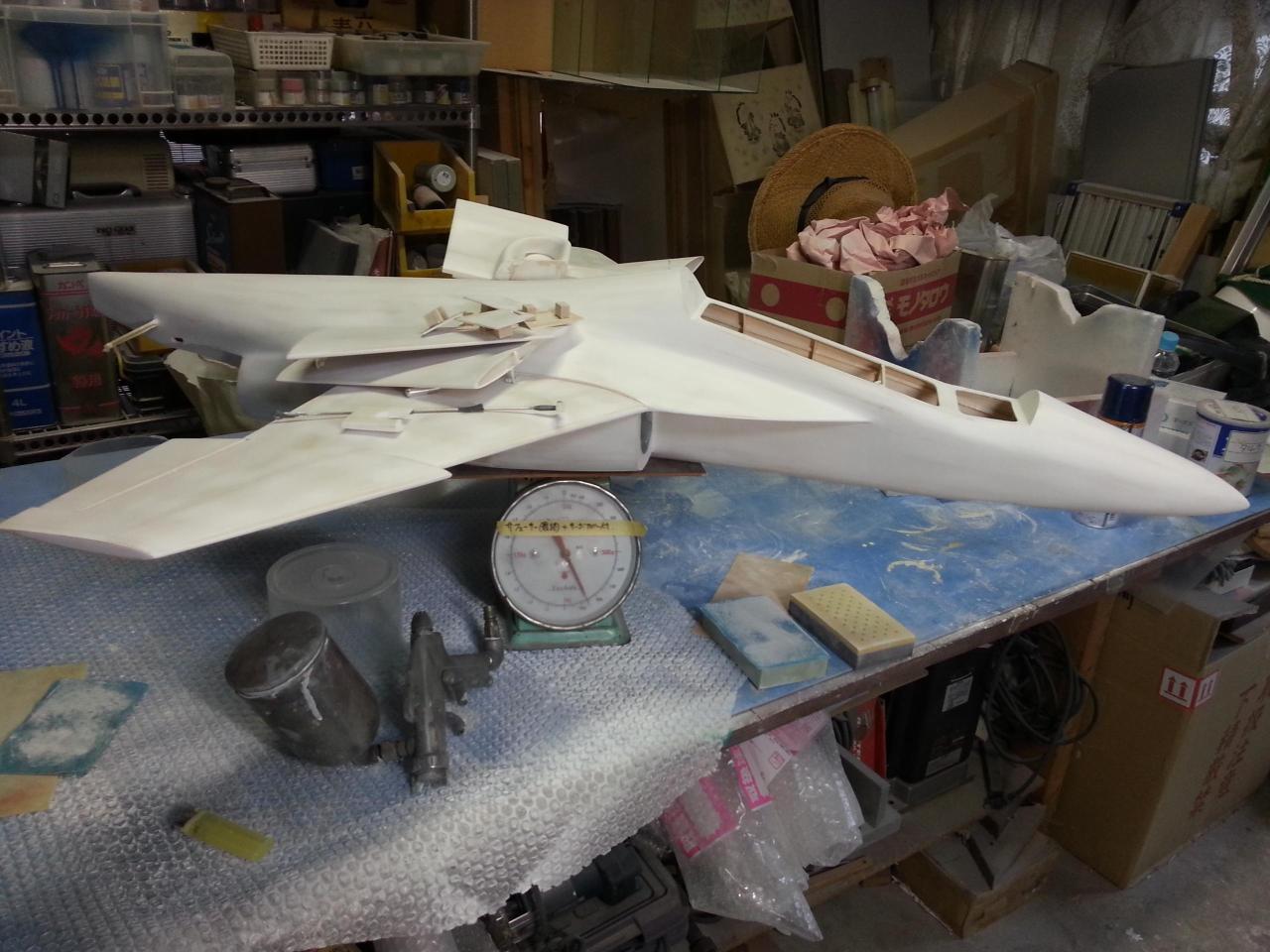 スプレーガンで白サフェーサー(タルク入り)、軽くサンディング(この段階で840g)、サーボ取付カバーを作り(この段階で860g)