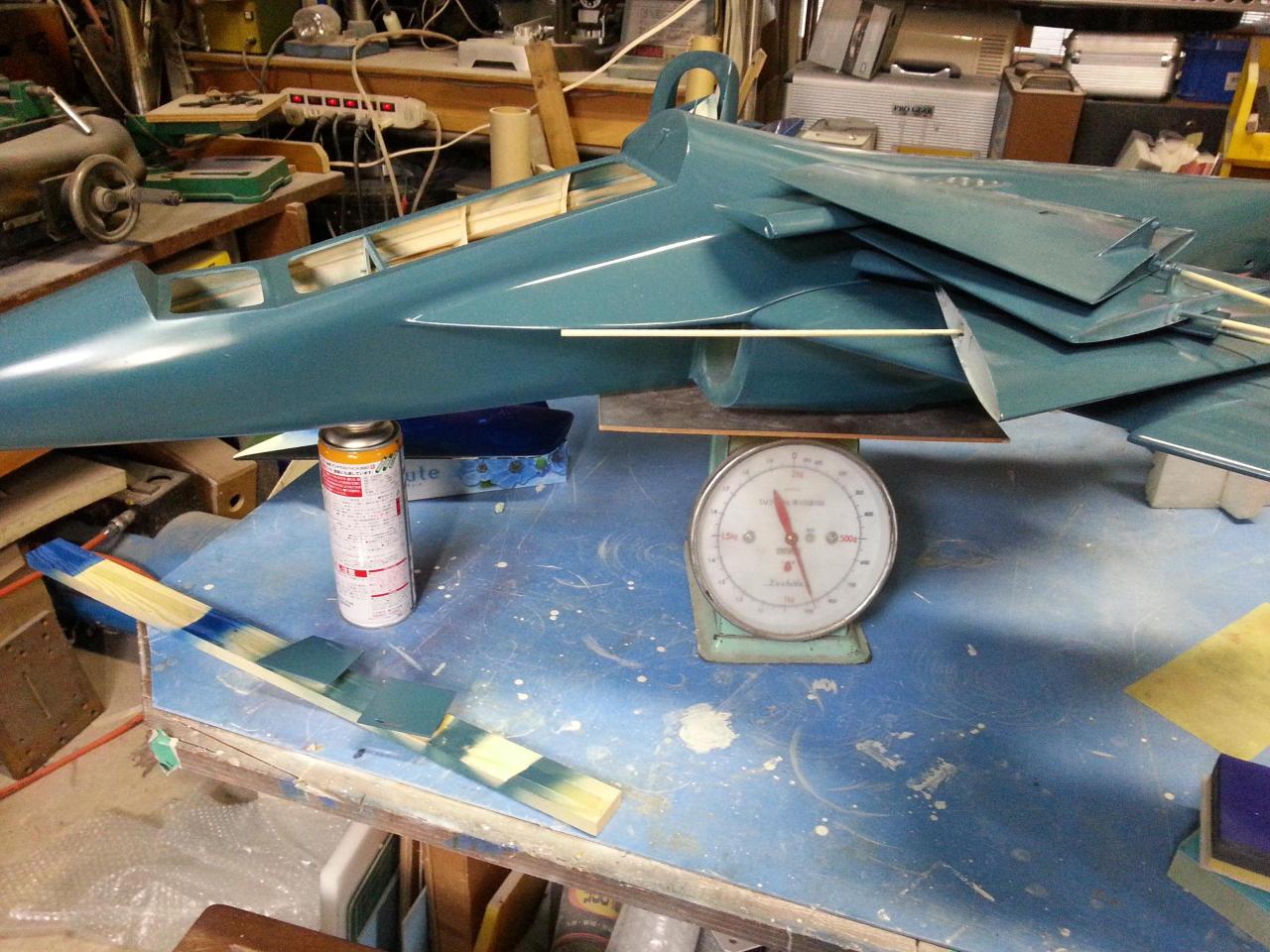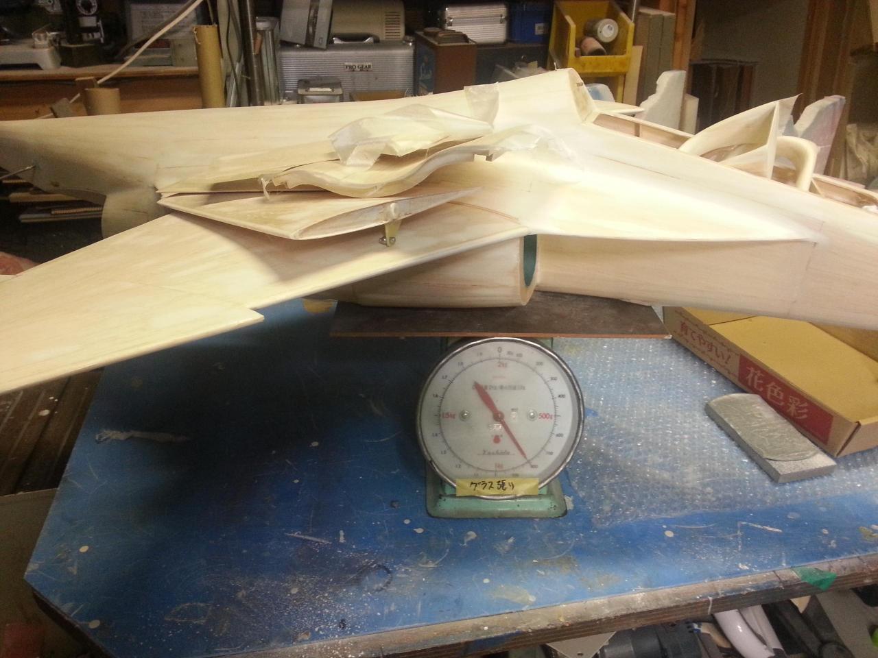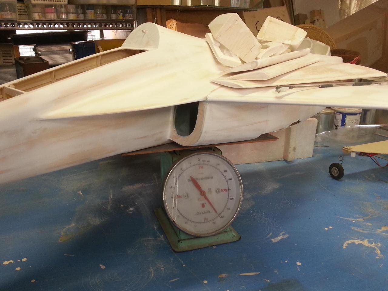 スプレーガンで白サフェーサー(タルク入り)、軽くサンディング(この段階で840g)、サーボ取付カバーを作り(この段階で860g)