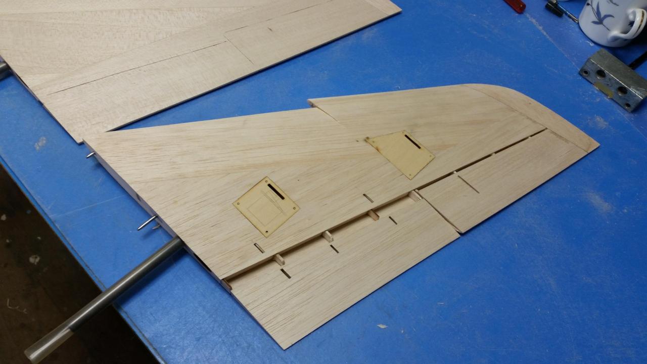 水平尾翼と垂直尾翼の製作、水平尾翼の取り付け部を削る研磨冶具